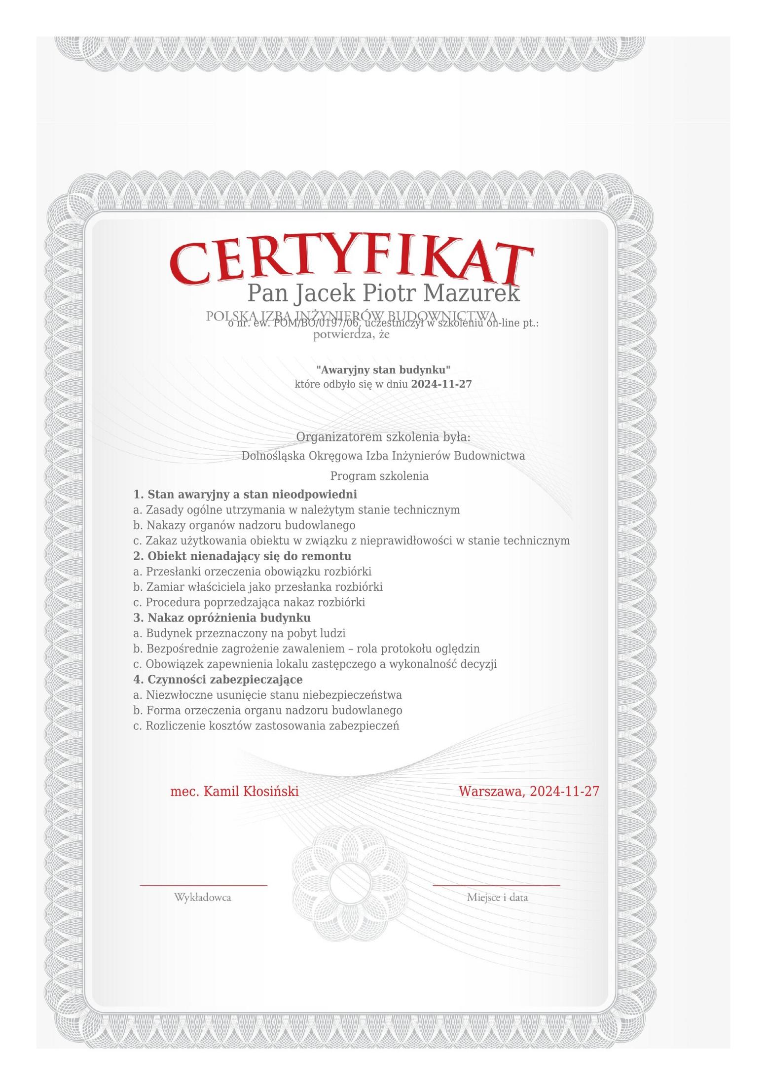 Nazywam się Jacek Mazurek i jest członkiem Pomorskiej Okręgowej Izby Inżynierów Budownictwa o numerze ewidencyjnym POM/BO/0197/06, posiadam: