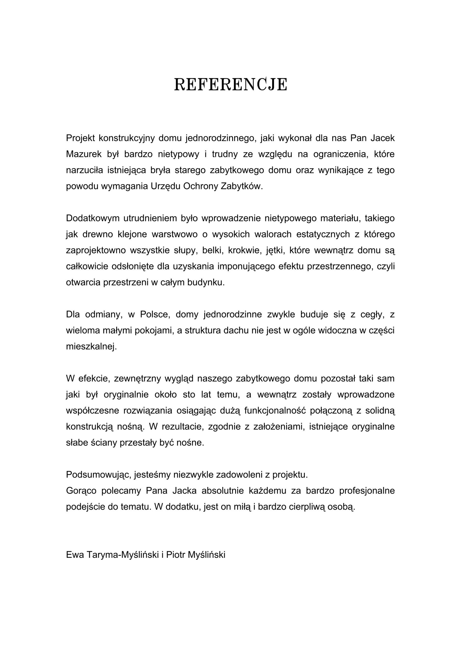 „Zaświadczam, że dokumentacja zawsze spełniała nasze oczekiwania i wykonana była z najwyższą starannością oraz zgodnie z obowiązującymi normami i przepisami.